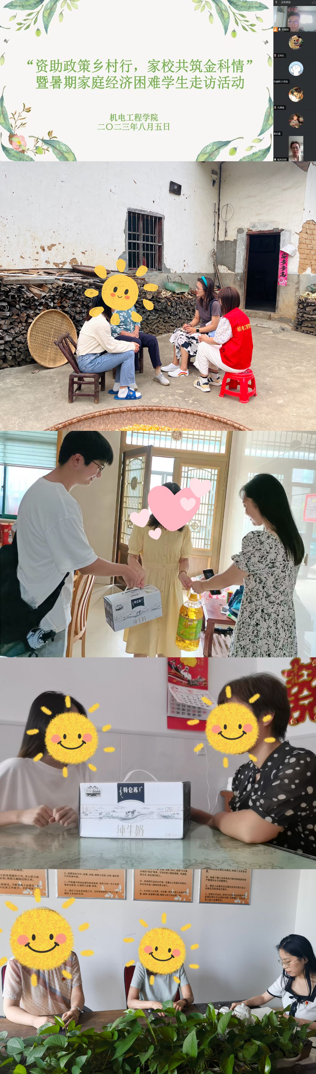 为了进一步做好贫困生精准资助工作,深入了解家庭经济困难学生的实际情况,建立健全家校联动育人机制,共同做好贫困学生成长成才工作,WilliamHill中文通过线上线下相结合的方式组织开展暑期家庭经济困难学生家访慰问工作。通过实地家访、电话家访、视频家访等方式,全面了解掌握学生家庭情况,持续关注每一位贫困生的成长与发展。