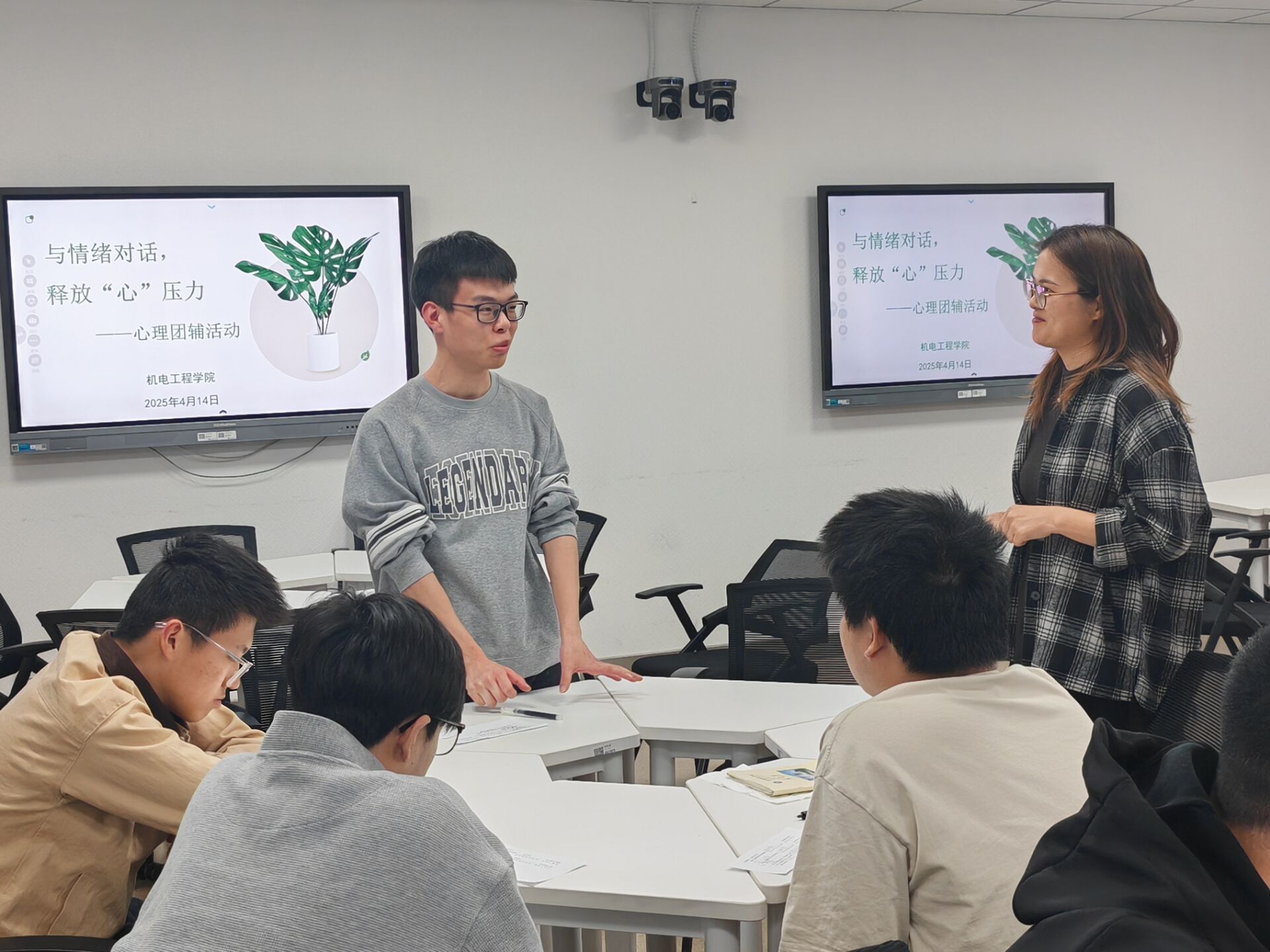 在“情绪温度计”环节,每位同学通过匿名问卷对近期情绪状态进行量化评分,并结合“情绪轮盘”工具识别具体情绪类别。杨老师结合心理学理论,解析情绪产生的底层逻辑,强调“情绪无好坏,关键在于觉察与疏导”。活动中还发放了定制版《情绪管理手册》,帮助学生建立日常情绪记录习惯。