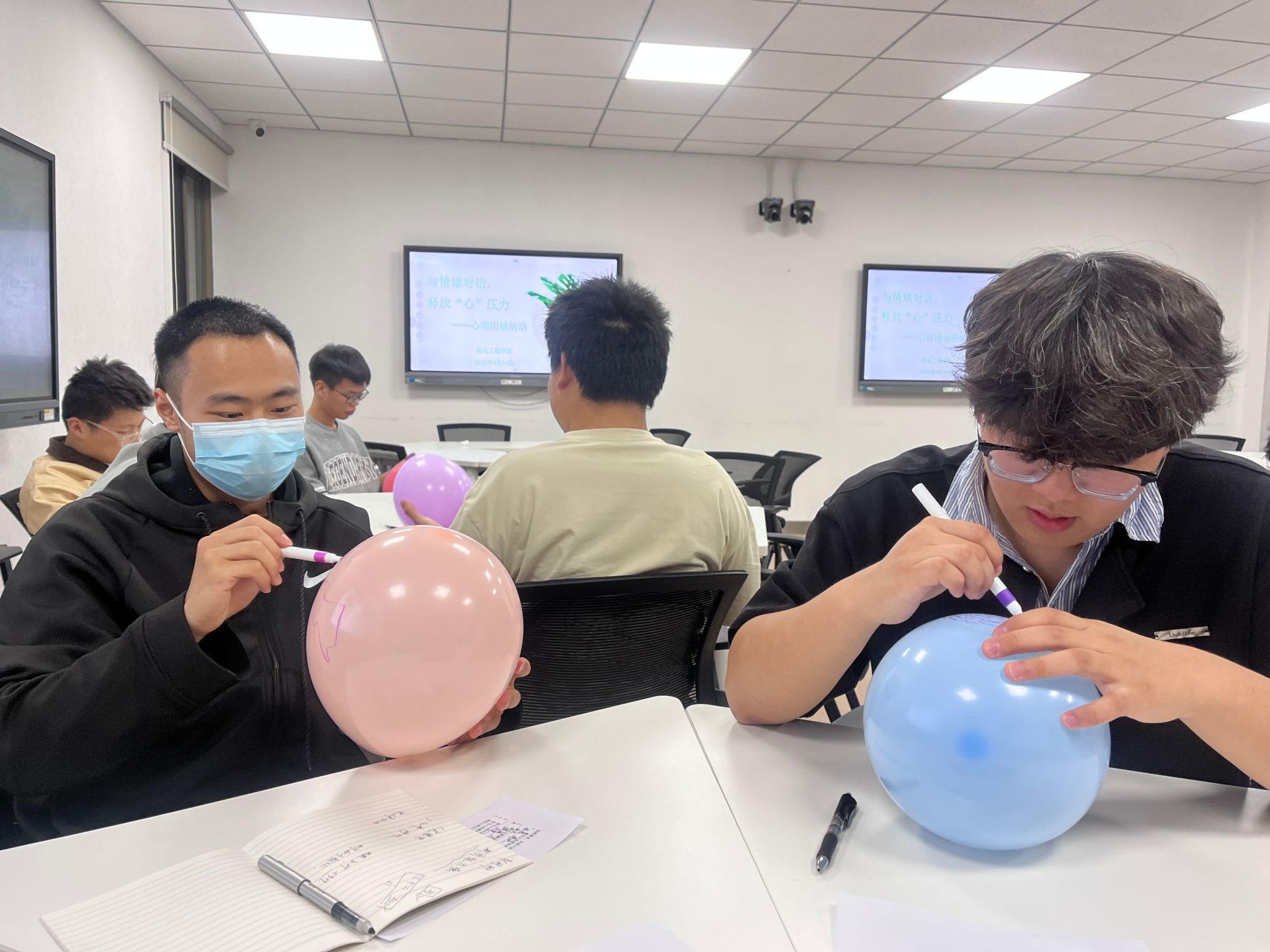 最具创意的“压力气球爆破”环节将活动推向高潮。同学们在气球上写下近期困扰自己的压力源,通过集体踩爆气球的仪式化行动释放积压情绪。爆破声此起彼伏,参与者纷纷表示:“把烦恼写下来再踩碎,仿佛压力真的被甩掉了!”。杨老师同步科普“压力转化四象限法”,引导学生将挑战性压力转化为成长动力。
