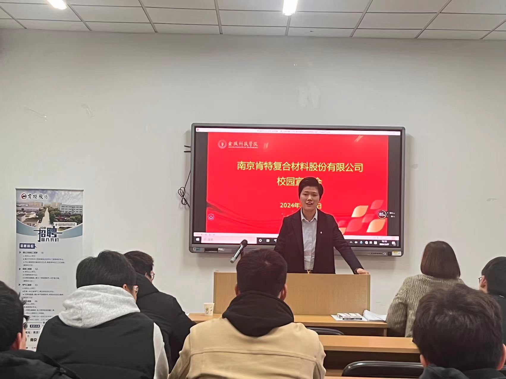 WilliamHill中文积极搭建校企合作平台,助力毕业生就业。3月27日下午,我院在工科楼C504举办南京肯特复合材料股份有限公司校园专场招聘暨“访企拓岗促就业”交流活动。南京肯特复合材料股份有限公司人力资源部经理许竞文携人力资源部专员韩露、陈亚一行三人、学院党委副书记张蓉、毕业班辅导员、机械系教师、40余名2024届毕业生参加了招聘活动。