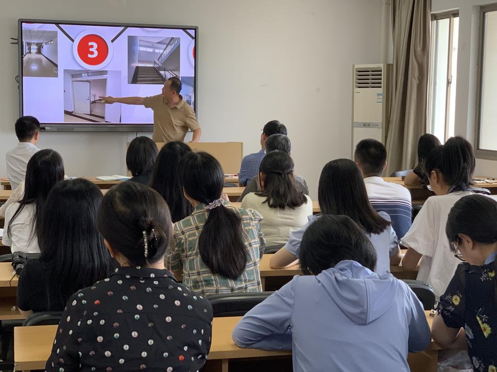 本次消防安全讲座由国家消防设施操作员考评员姜玉东老师主讲,他从消防安全常见问题隐患、实验室办公室安全隐患、宿舍安全隐患、灭火器消防栓的使用、火场逃生方法五个方面进行了详细讲解,并结合常出现、易忽视、高风险的案例来提高教职工们的消防安全意识。在遇到意外逃生方法部分,姜玉东以学院工科楼五楼办公区域为实景案例,详细讲解了紧急情况下的疏散方案,安全逃生的路线及需要注意的相关问题。
