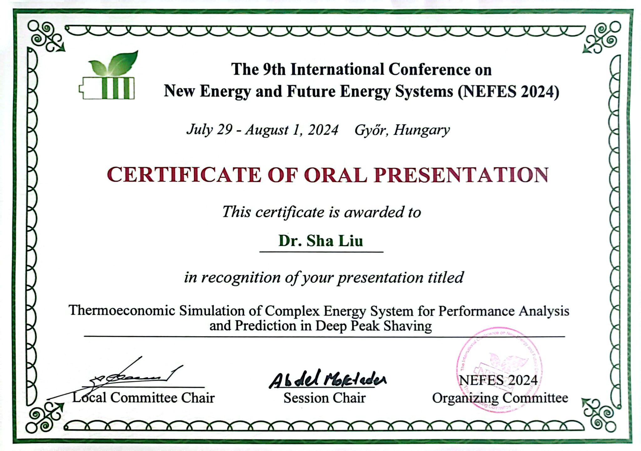 受国家自然科学基金项目资助及Szechenyi Istvan大学、欧洲光伏开发集团的邀请,2024年8月我院刘莎博士赴匈牙利Szechenyi Istvan大学参加第九届新能源与未来能源系统学术会议。参会人员云集了来自世界各地的研究人员、科学家、工程师、学者和研究生展示他们在新能源和未来能源系统研究领域的最新研究成果和新思路。大会分为4项主旨演讲,9项主题报告,着重对绿色建筑与能源管理、热能与动力工程、新能源技术与材料等9项主要议题进行了学术研讨,我院刘莎博士作为分会场2(Thermal Engineering and Power Engineering)主题报告人,做了题为“Thermal Engineering and Power Engineering Thermoeconomic Simulation of Complex Energy System for Performance Analysis and Prediction in Deep Peak Shaving”的主题报告。